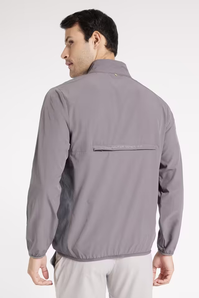 This jacket has a mock neck, black zipper closure at the front, and breathable mesh fabric on the sides.